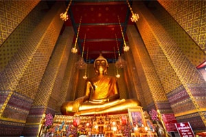 寺庙中的主佛像建于1325年,是用水泥浇筑而成。这座高19米的巨大佛像表现了佛祖征服妖魔的情景。相传,在缅甸入侵者洗劫大城时,它流下了眼泪,深受当地居民的敬仰。泰国经商的华人也非常敬仰寺内供奉的众神佛,常到这里向佛祈求许愿。