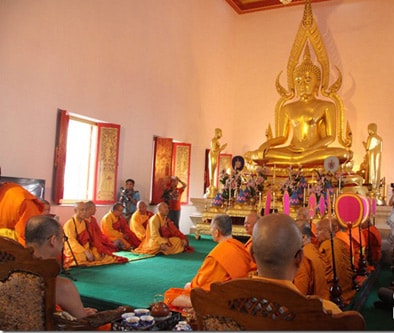 在泰国,新佛像的落成仪式要持续整整一夜,从头天黄昏到第二天黎明。黄昏时分,佛殿中站满了和尚,他们以及在家的善男信女们都开始集体唱赞。仪式先是三皈依的声明,再领受五戒,整个夜里主要都是唱诵护咒经。一般认为,唱诵护咒经只会在深信佛陀言教又有智慧的听众中产生莫大功德。既可以使听诵经的人安住佛法,又可以让善功德传递到信众身上。诵经的和尚们由此也可忆起佛陀对一切众生本来怀有的慈悲,当然最终诵经的声音还可以创造身心的和谐。诵护咒经还可以祛病驱魔。