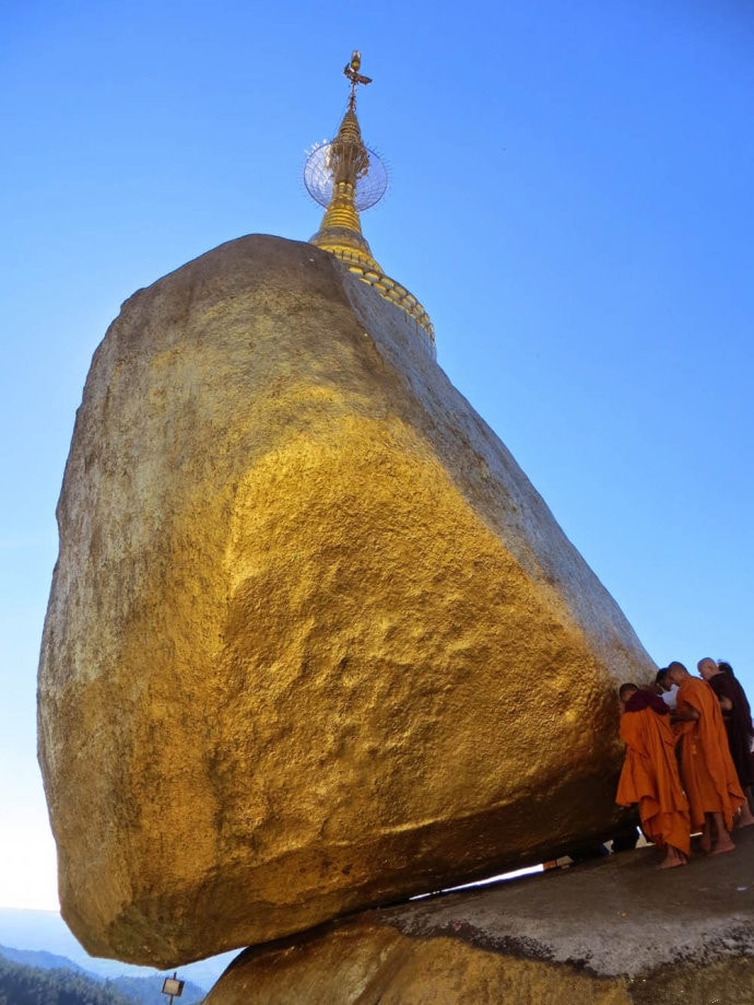 佛塔每日都有信徒贴金箔,这也是称呼为大金石的缘故,在东南亚的佛教信徒心中,为佛像或圣物贴上金箔,是最大的祈福方式,而千百年来的参拜,也让这块石头如同镀金一般的闪亮。